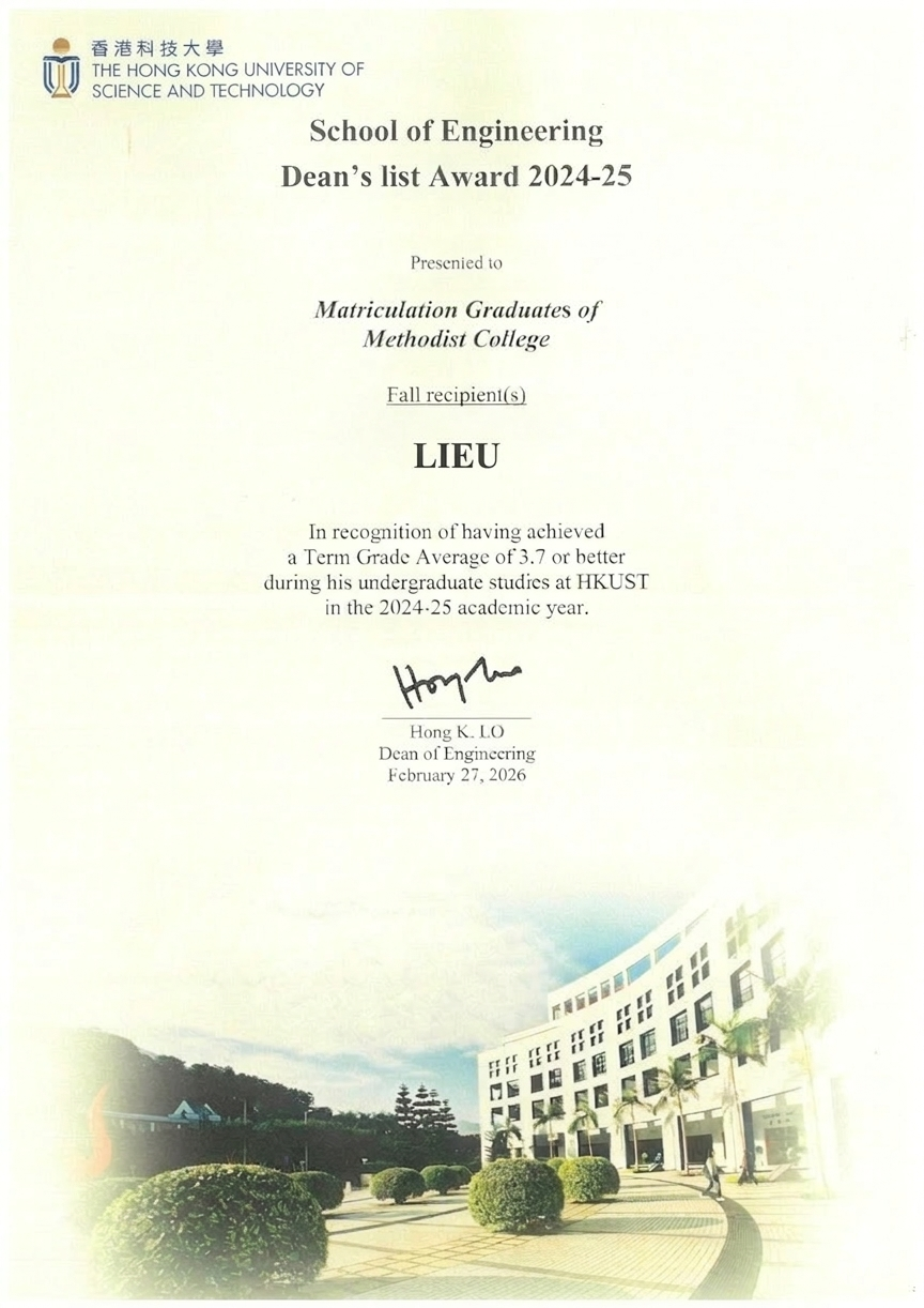 The following alumni have been named to the Dean’s List in recognition of their outstanding academic performance during their undergraduate studies at HKUST for the 2024/25 academic year.